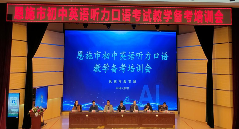 為響應(yīng)湖北省中考政策要求,加快推進(jìn)恩施市英語教師口語教學(xué)意識(shí),培養(yǎng)學(xué)生英語聽說能力,10月25日,恩施市教育局在恩施思源實(shí)驗(yàn)學(xué)校開展了恩施市初中英語聽力口語考試教學(xué)備考培訓(xùn)會(huì)。大會(huì)由恩施市教學(xué)研究和教師培訓(xùn)中心副主任董祖昌主持,出席本次活動(dòng)領(lǐng)導(dǎo)有:恩施市教育局副局長劉靜,恩施市研培中心副主任董祖昌,恩施市研培中心初中室主任付勇,恩施市研培中心初中英語教研員康詠梅及恩施市各初中學(xué)校教學(xué)副校長、英語教研組長、各年級(jí)英語備課組長150余人。